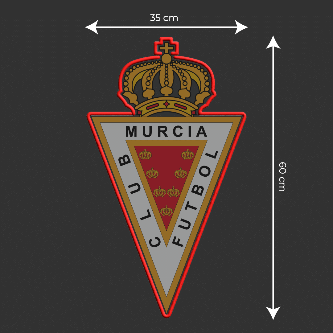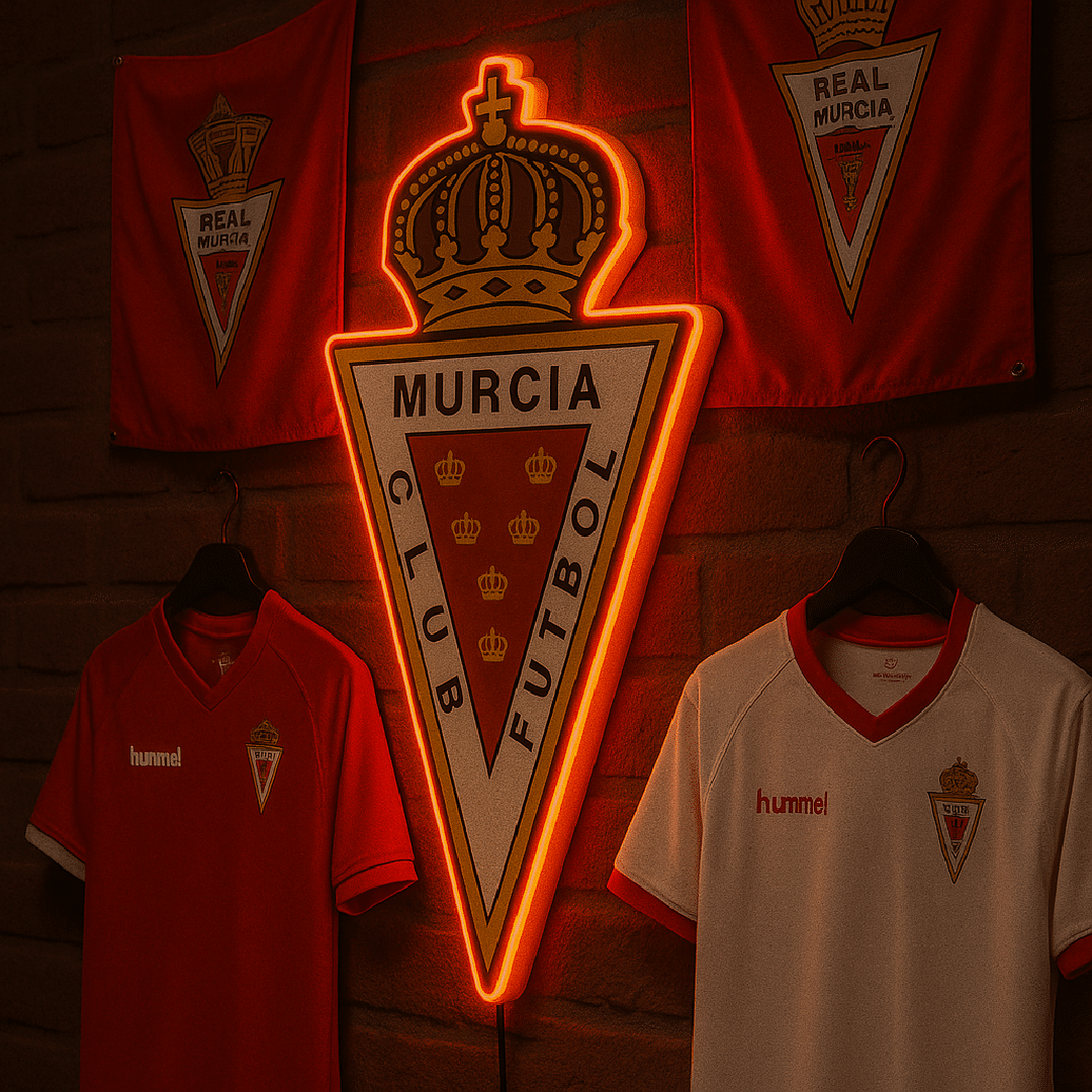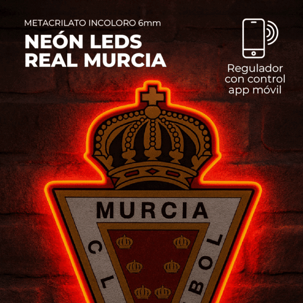 Neón LED premium Del Real Murcia fabricado en metacrilato incoloro de 6 mm con vinilo trasero para visualización también en apagado. Medidas: 61×60 cm. Iluminación LED Neón Flex 12V en Rojo. Incluye soporte para colocar sobre mesa o estantería y opción de fijación en pared. Regulador inteligente con múltiples efectos de luz, controlable por app móvil mediante QR. Ideal para decoración deportiva con estilo.